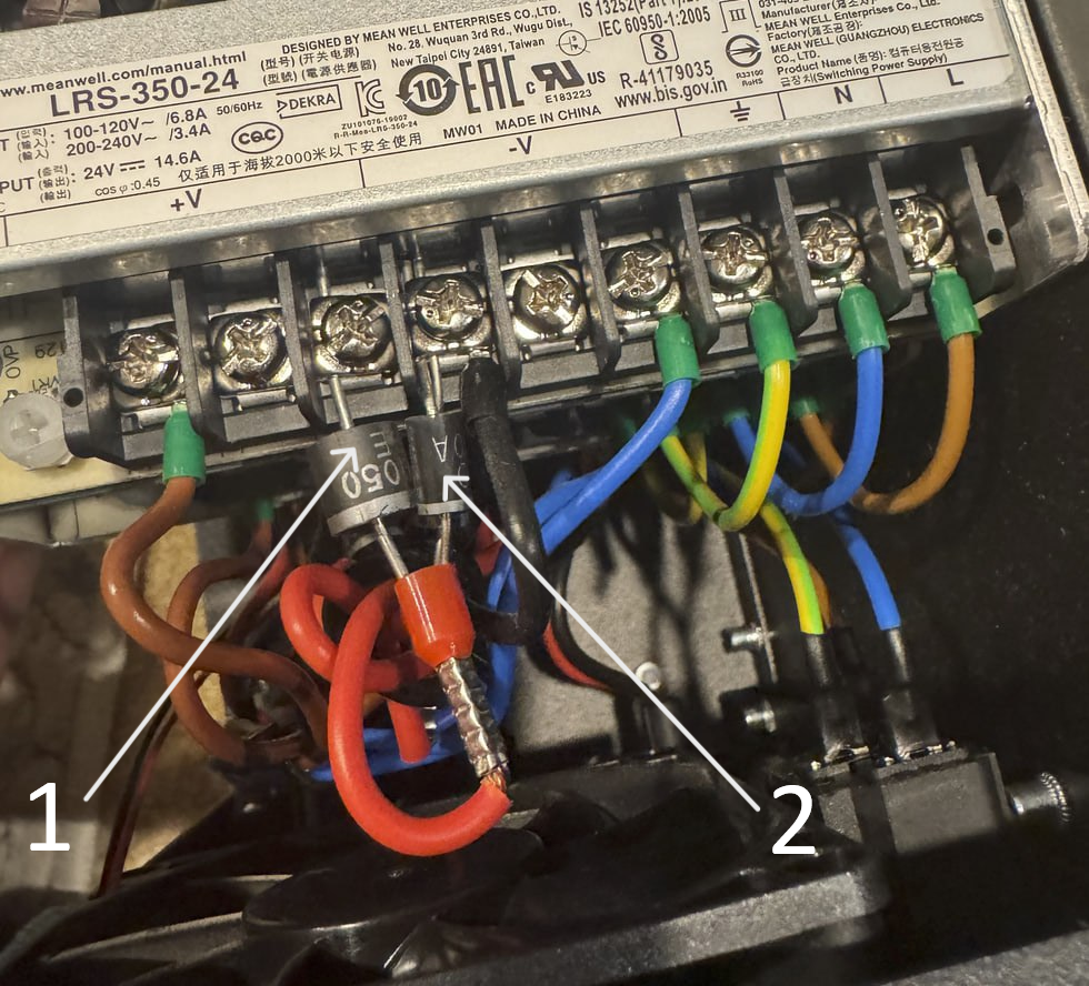 Disconnect the diode (#2 in the figure) → Does the green LED on the power supply turn on?